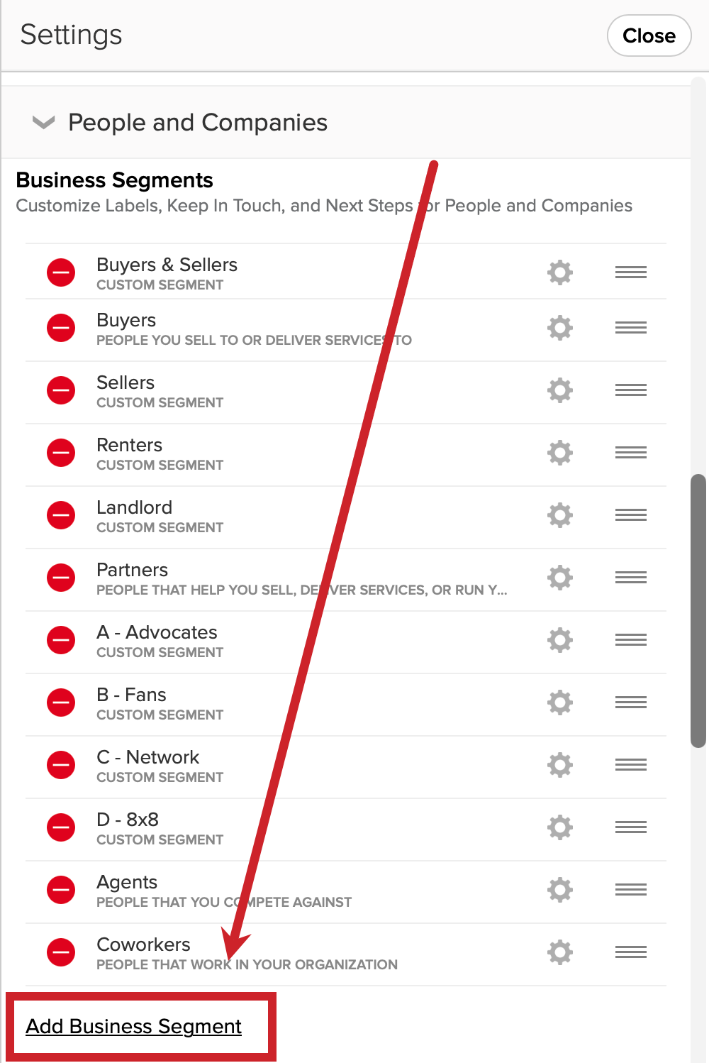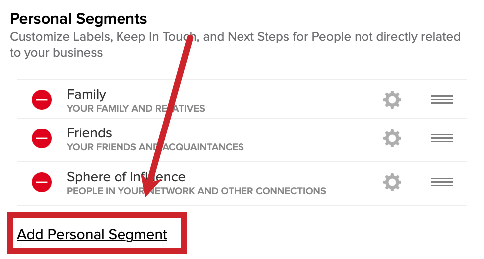 2.) Under Customizations, tap on People and Companies to expand the section and then tap on the gear icon next to a Segment to customize labels, adjust your Keep in Touch settings, and Add/Edit Next Steps.