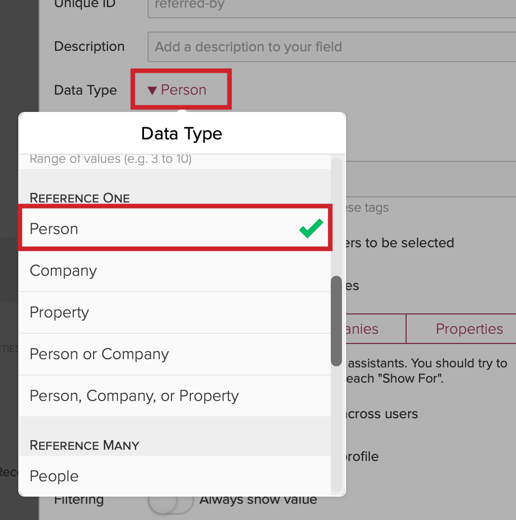 In this example, the "Referred By" field will appear on profiles in the People, but not appear on the Companies or Properties tab.