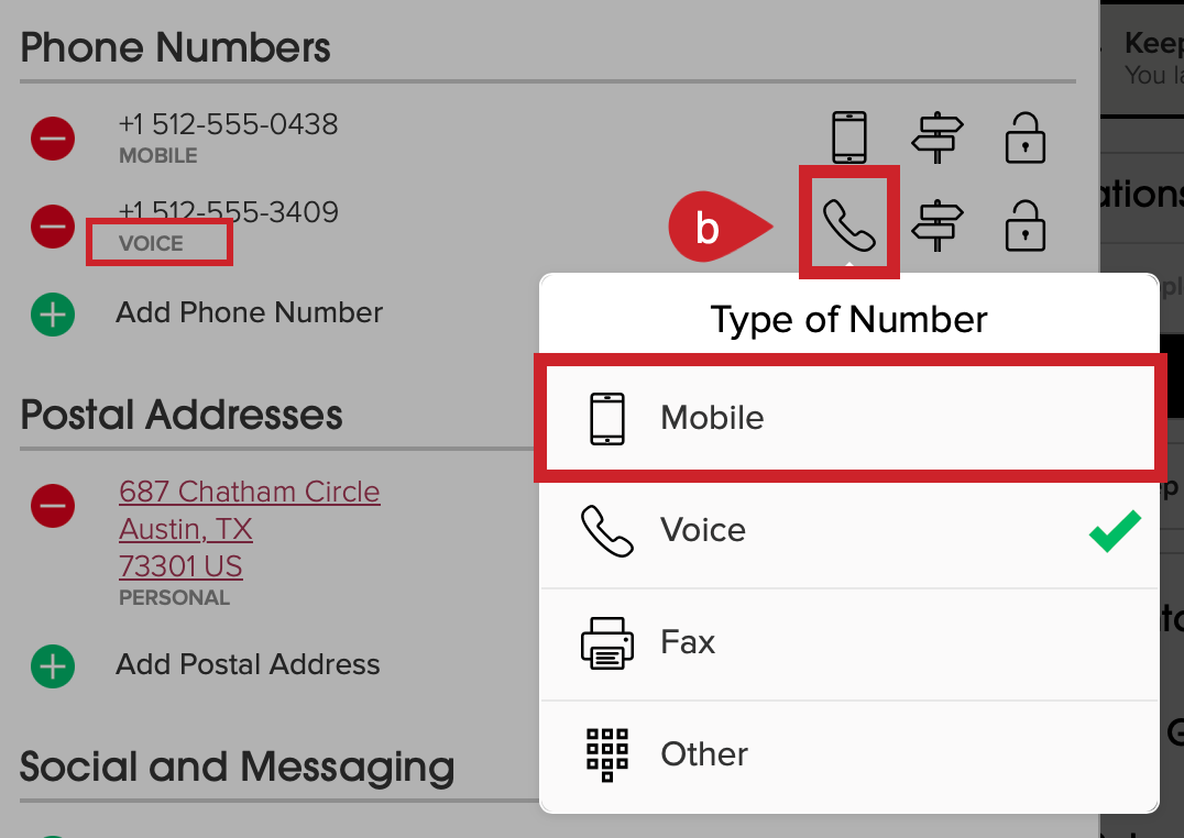 b.) If there is no label called "Mobile" (this example shows "Voice"), tap on the device icon and select "Mobile".