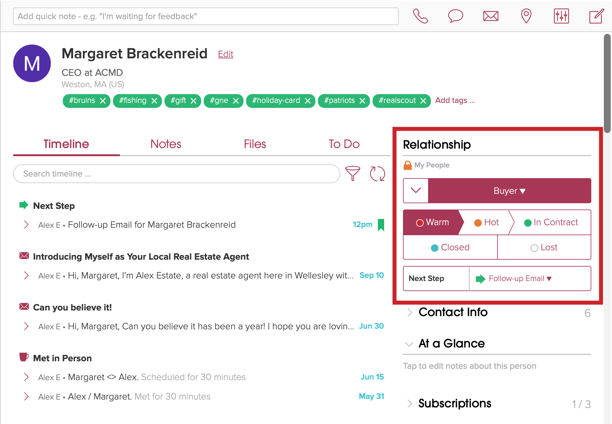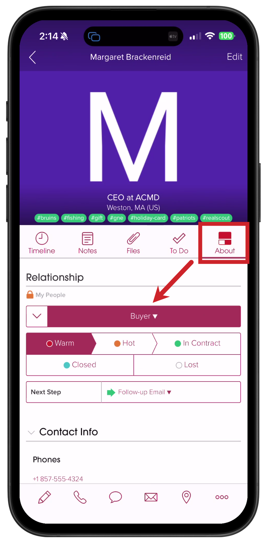 When you tap on a contact you’ll find a section within the profile called “Relationship”. The Relationship section includes Stages, Segments, Steps and Custom Fields.