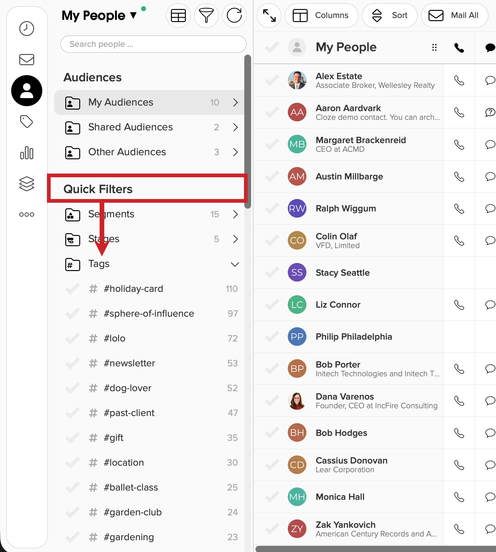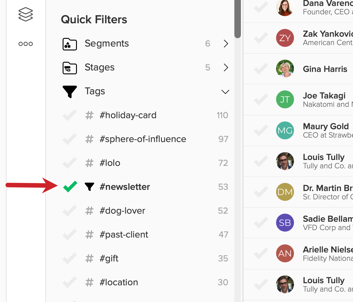 Tags are like labels that allow you to organize People, Companies, Projects, Properties, and Deals. They are helpful when you are trying to organize People or Projects or Deals that span different Segments.