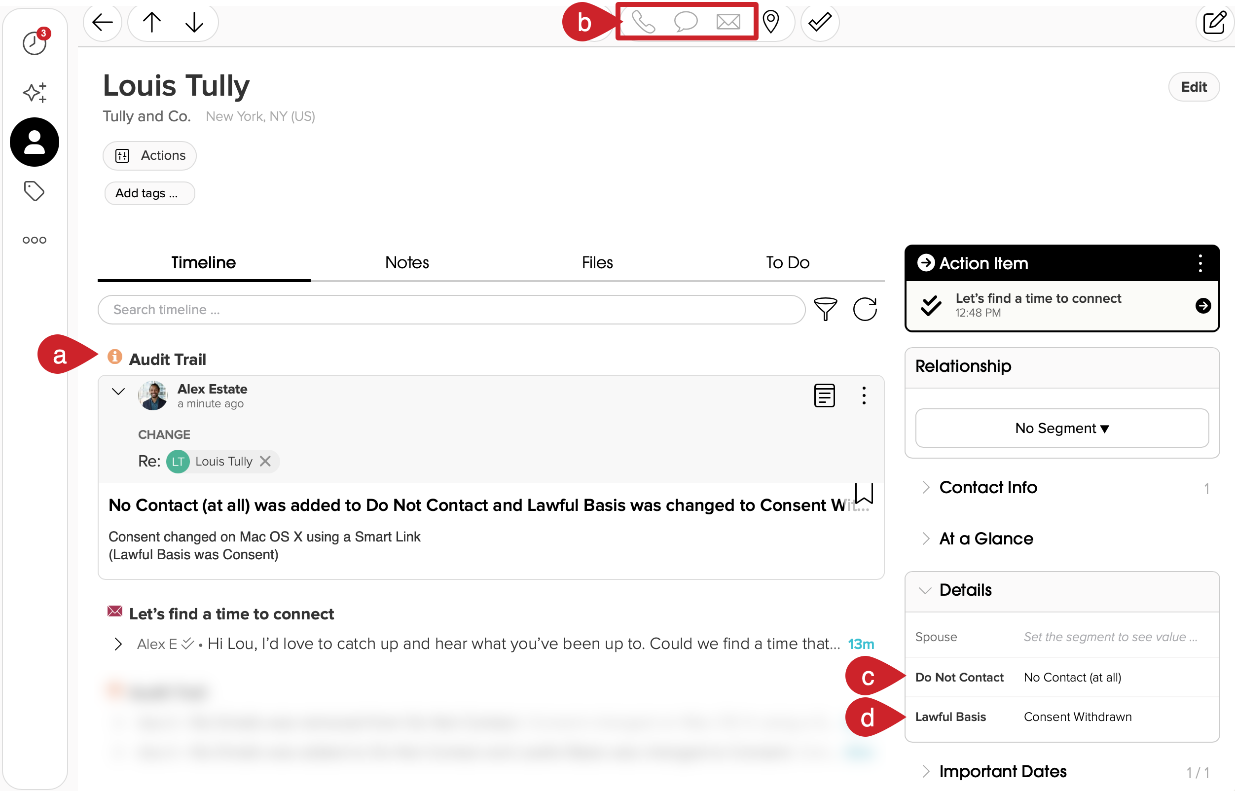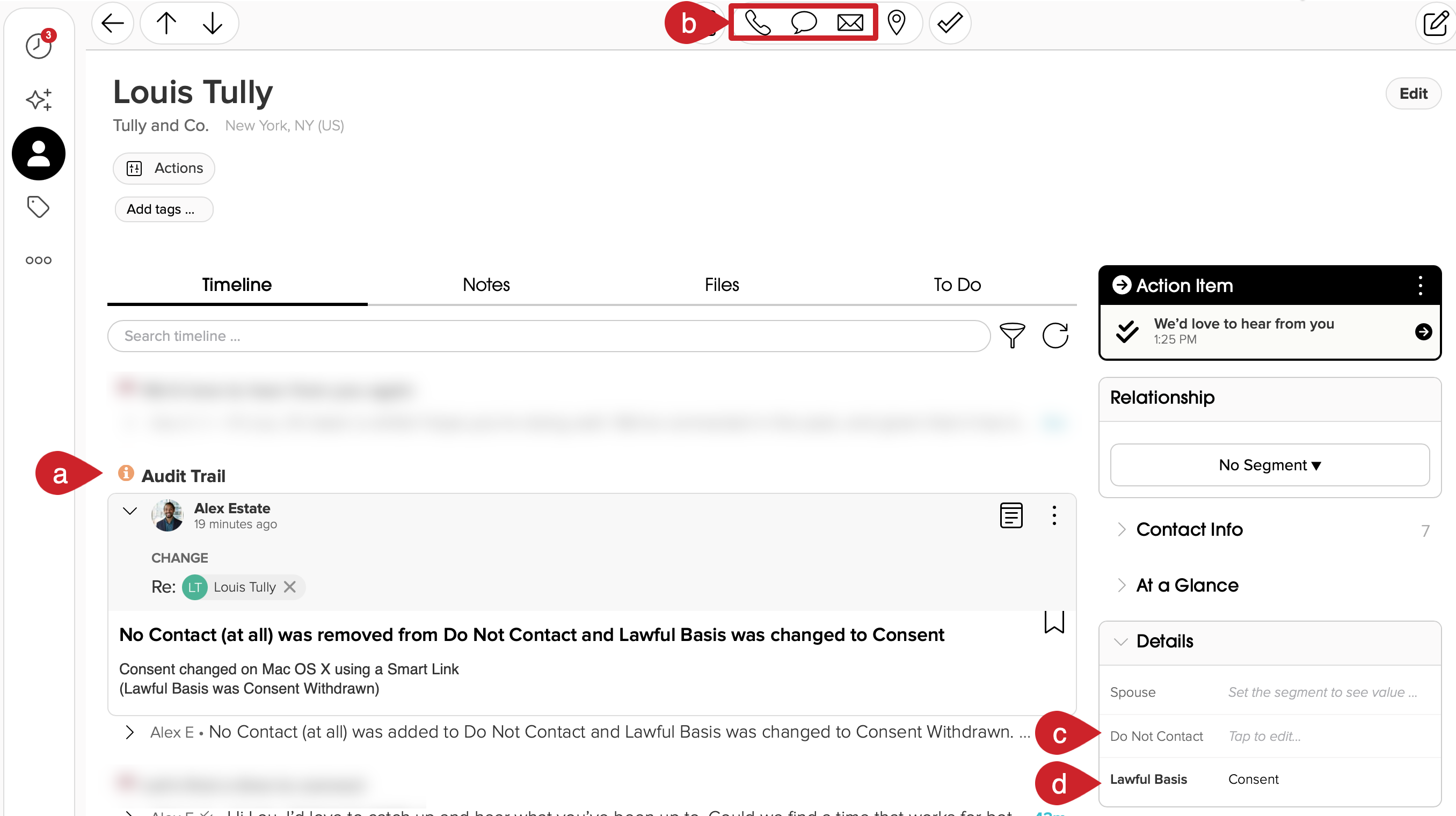 - Timeline Audit Trail is updated - When the recipient saves their preferences (e.g., they update their preferences), you will see an audit trail message in their Cloze timeline.