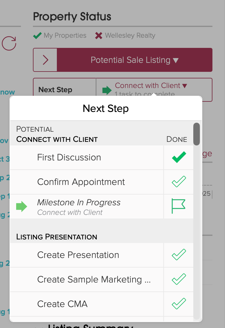 Add Next Steps to Properties, Projects, or Deals to help you keep track of what you've done and what you have left to do. Think of Next Steps as repeatable checklists that you can write once and reuse. They are the tasks you follow to ensure contacts move from one stage (such as warm) to the next stage (such as hot).