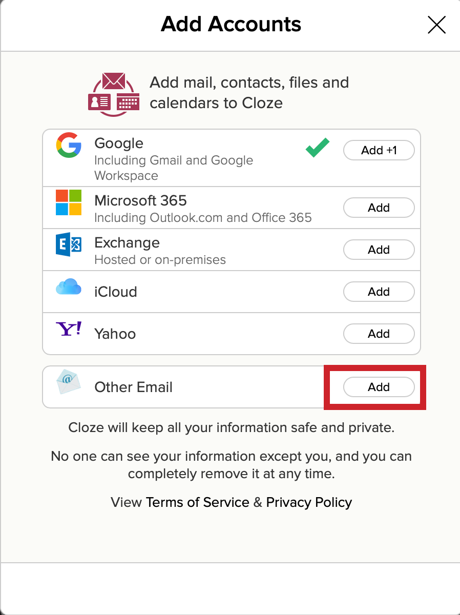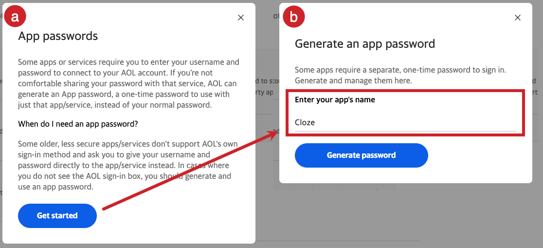 AOL requires you to create a third-party app password which you will use to connect your AOL email to Cloze. After you generate this password, you will use it to when connecting your AOL account to Cloze.