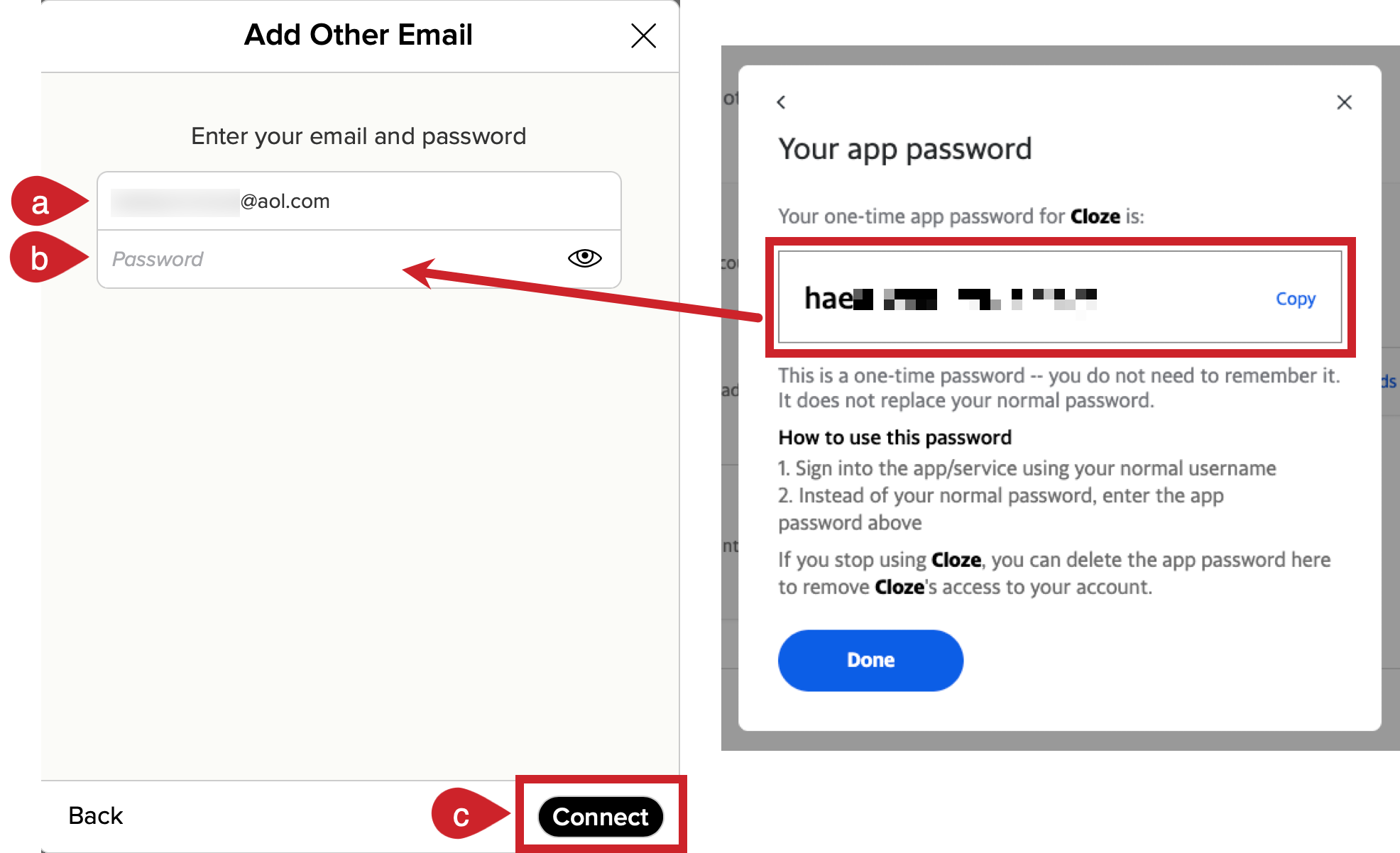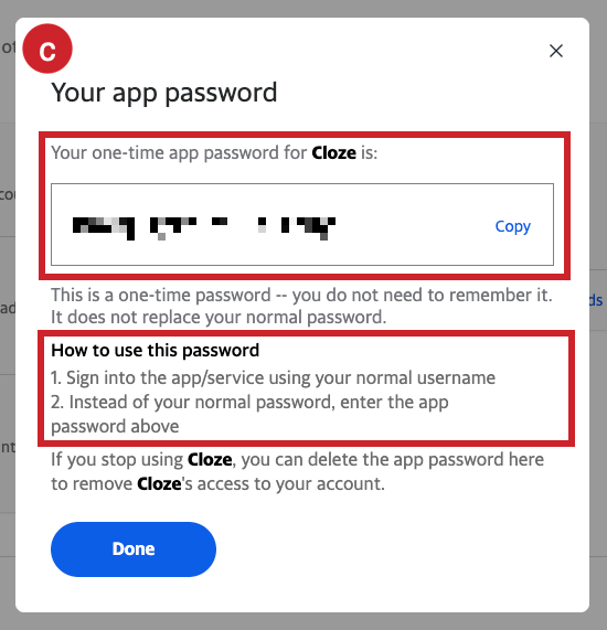 - Copy and save this app password. You will need it to connect AOL to Cloze.