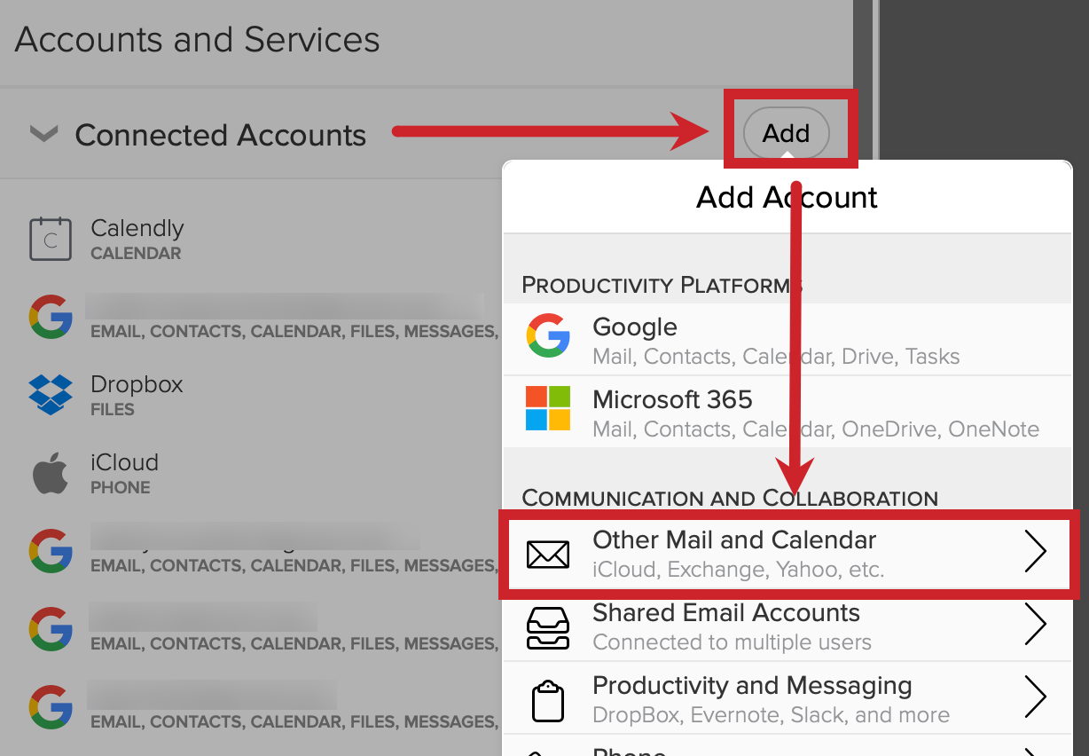 - Under Connected Accounts (tap to expand the section), tap on "Add" and select "Other Mail and Calendar".