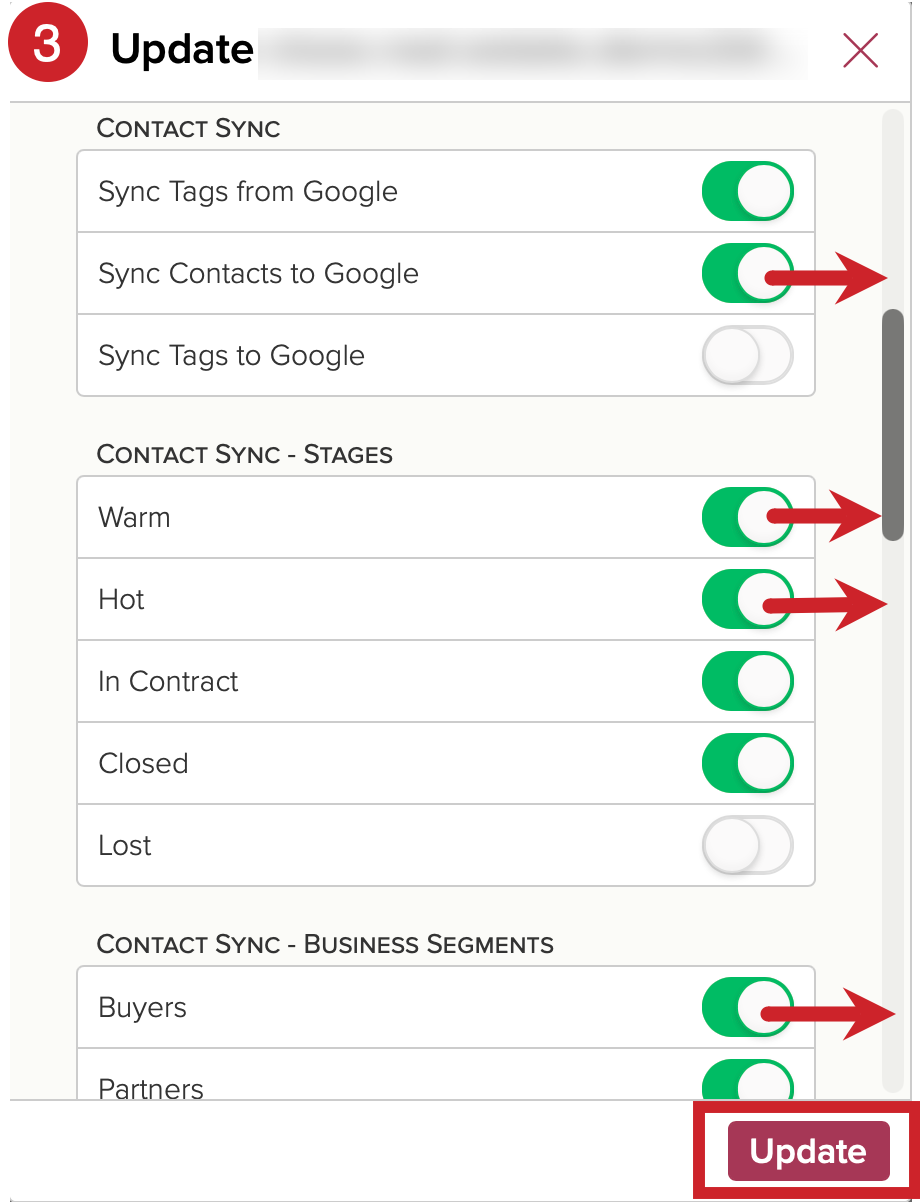 3.) Toggle on Sync Contacts to Google and then scroll down to enable the specific Stages and Segments you wish to sync to Google Contacts.