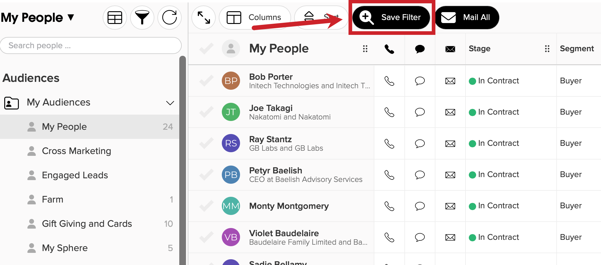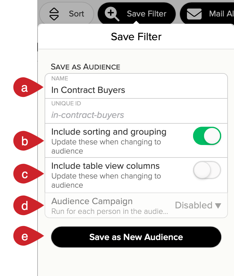 Below are instructions on how to apply filters and sort options to create an audience. You can save any filtered and sorted view as a new audience.