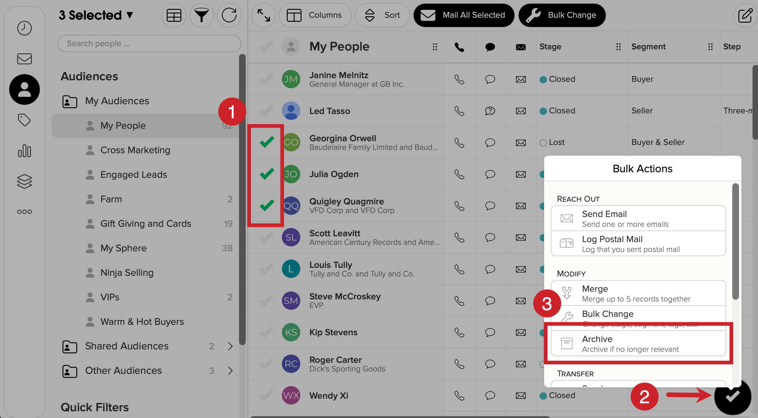 - You can archive contacts with no Stage set or the Inactive (Past) or Lost Stage set