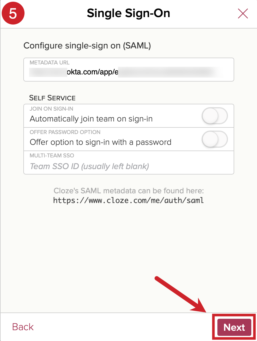 - Configure SAML 2.0 for Cloze (follow these instructions to find your metadata URL).