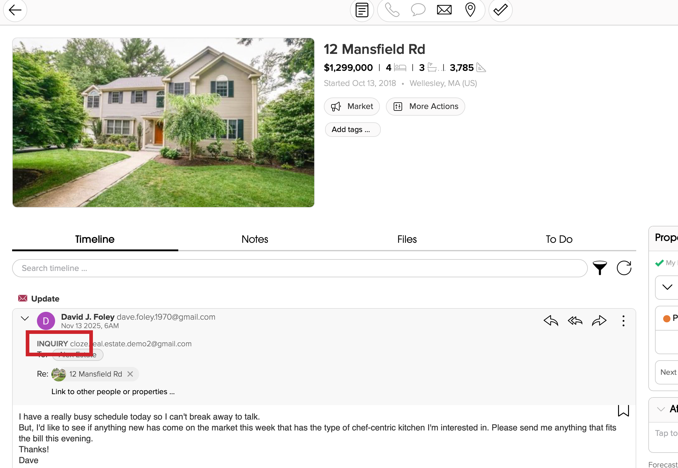Any call, text, or inbound email can be classified as an inquired and linked to the appropriate property (in the Re: section).