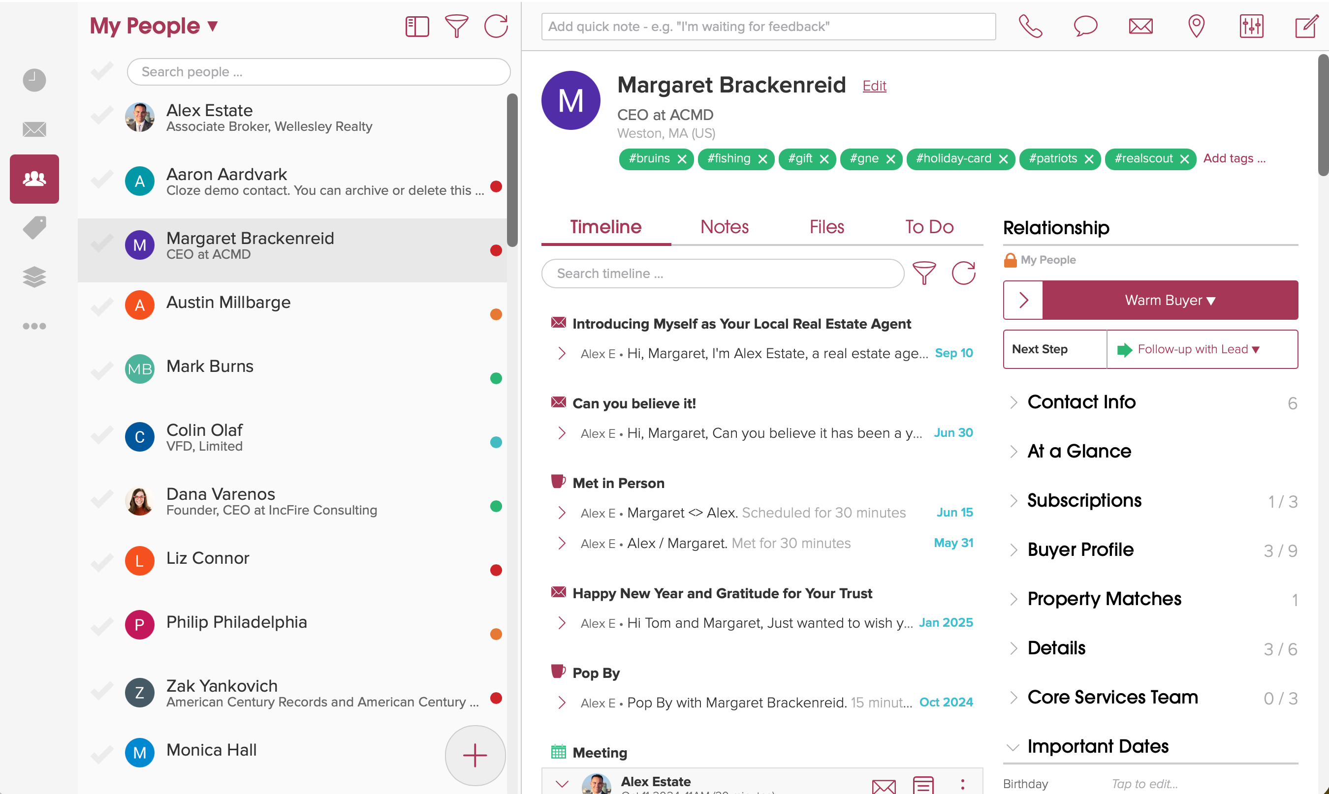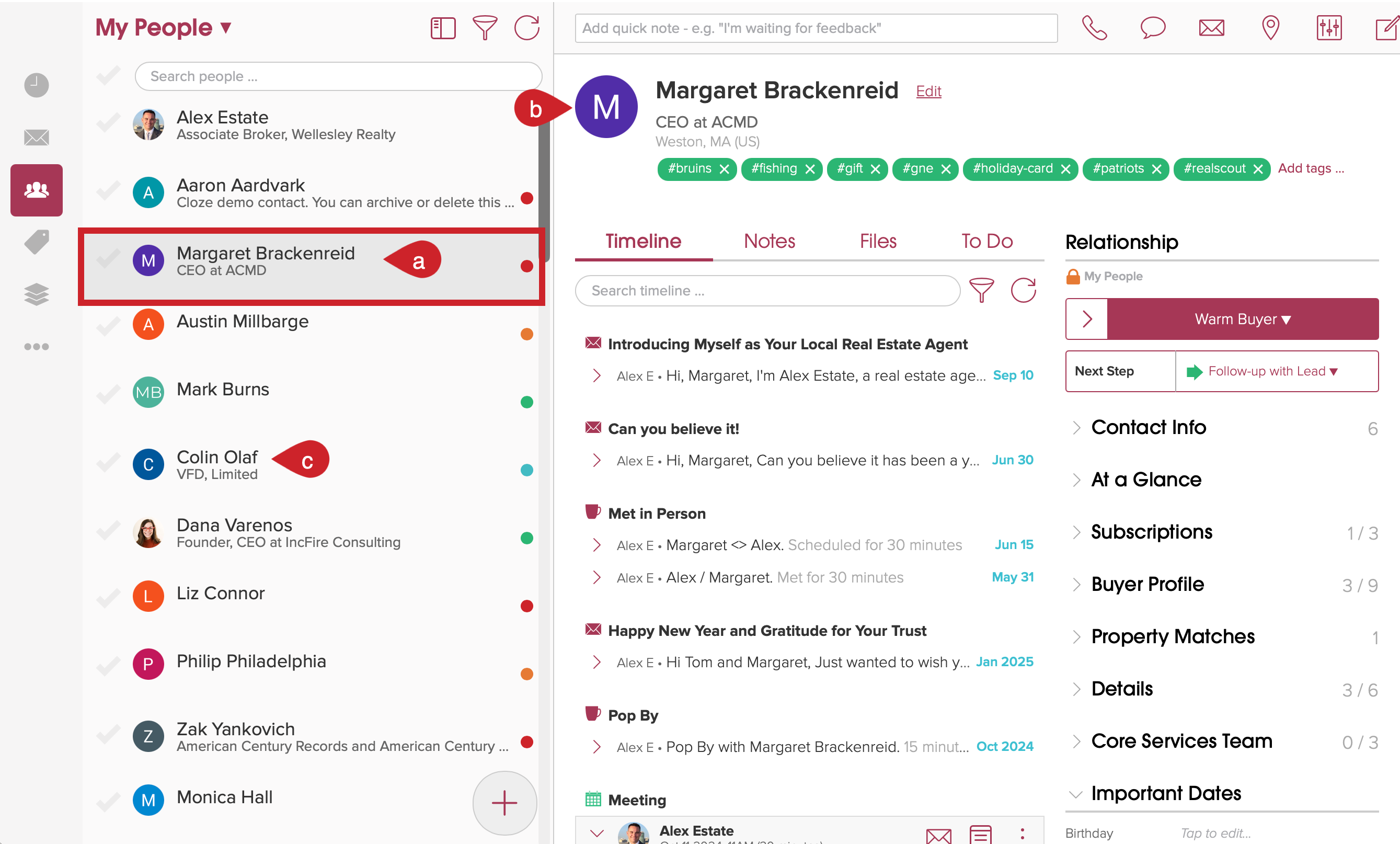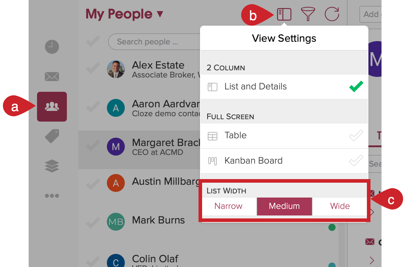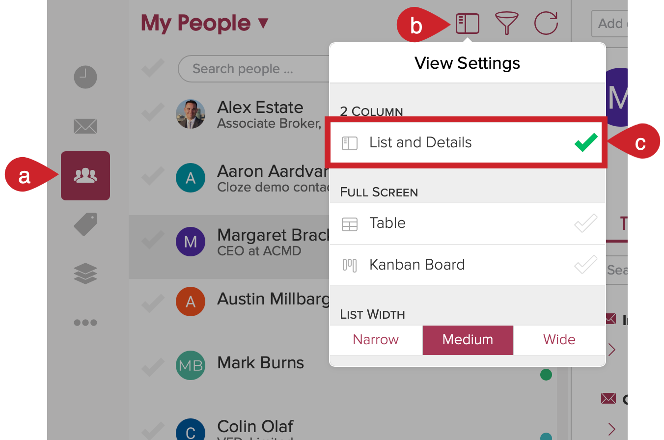 Use the 2 Column, List and Details option to quickly switch between people, companies, properties, and deals.