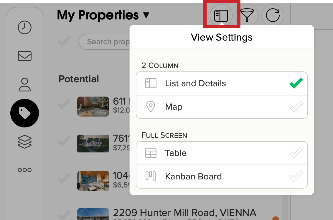 The 2 Column, List and Details view presents a single column of contacts on one side of the screen and, when selected the profile of a person in the other column. Use the 2 Column, List and Details option to quickly switch between people, companies, properties, and deals. Learn more about the 2 Column, List and Details view.