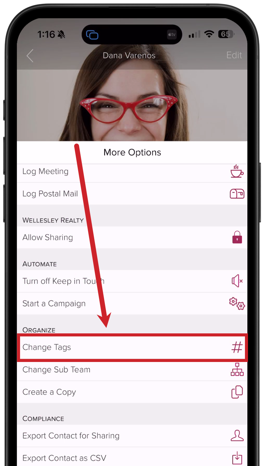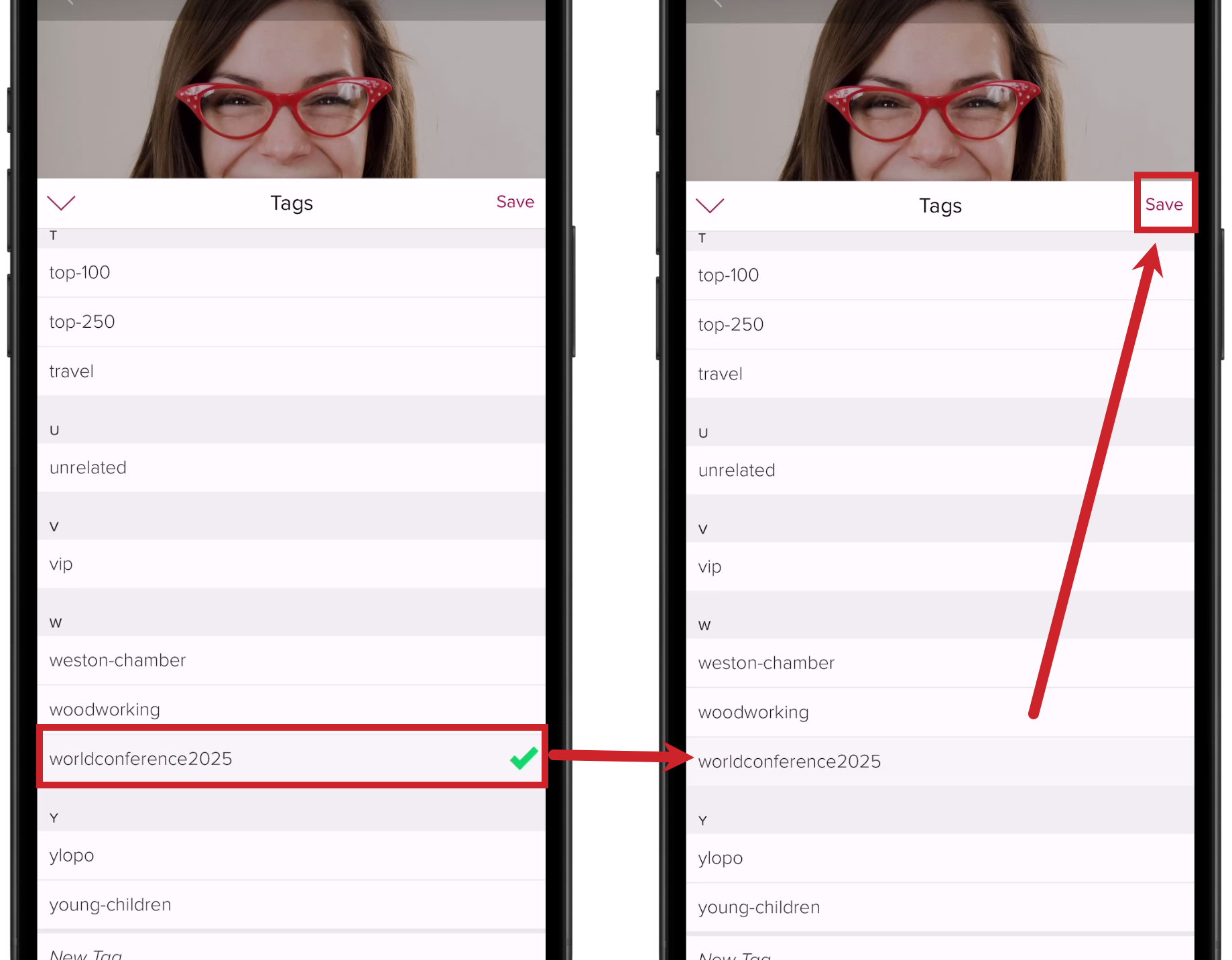 3.) Scroll down to the tag you want to remove, and then tap on it (this will remove the checkmark). Tap on Save. This will remove the tag from that contact.