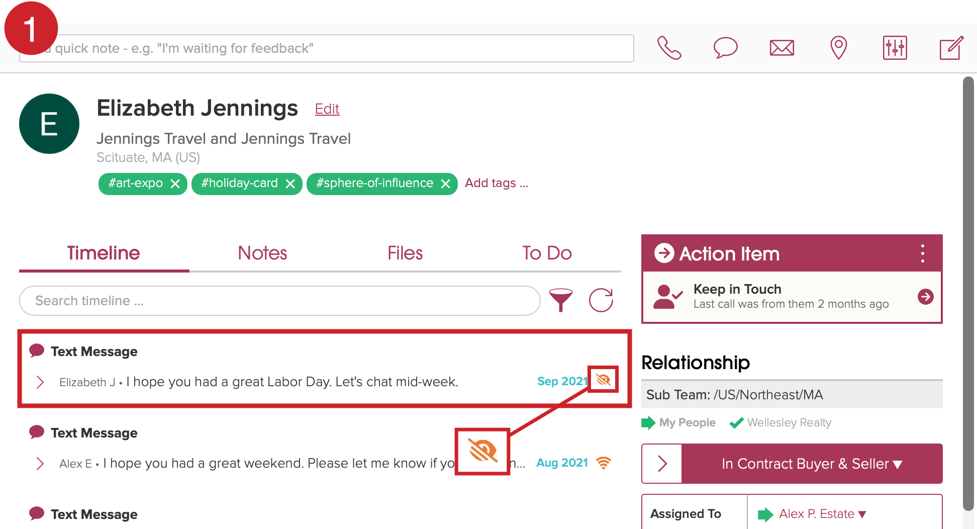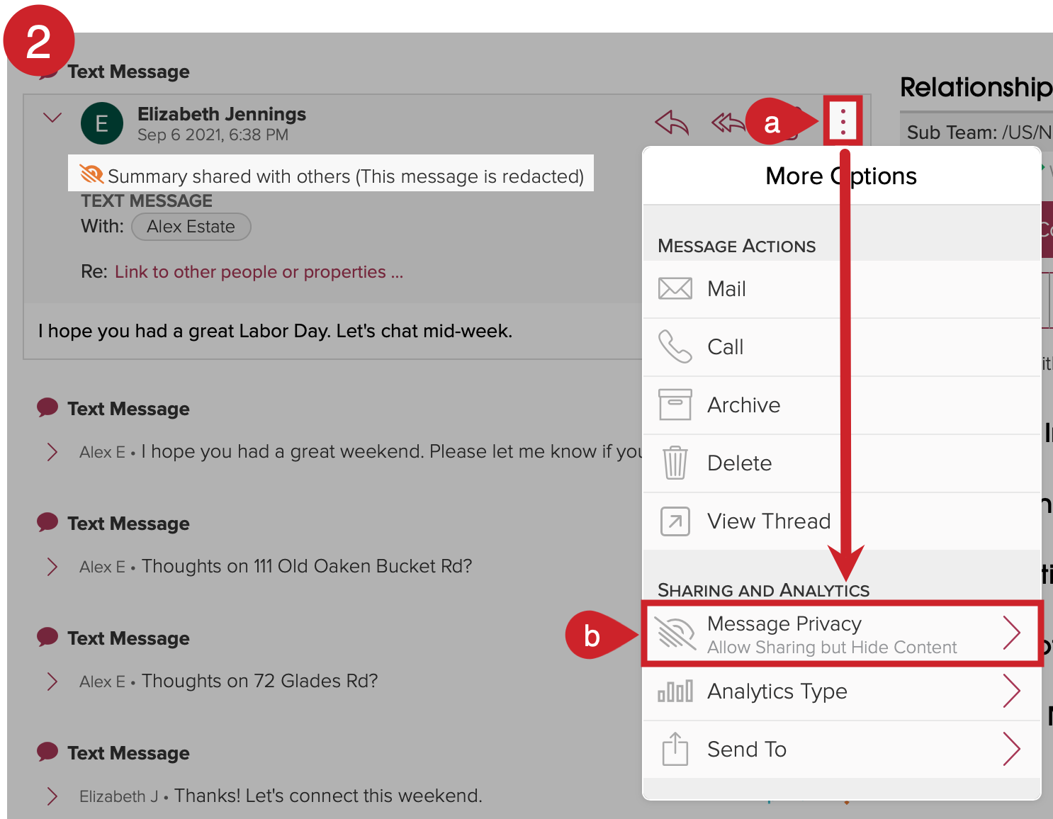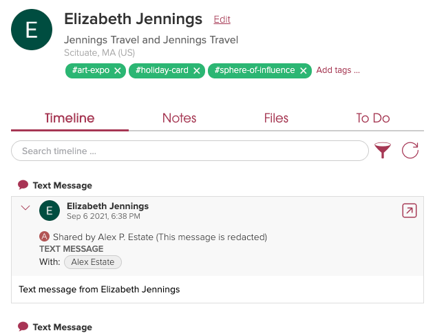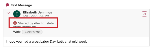 (In this example, team members can see that a text message occurred but they cannot see the content.)