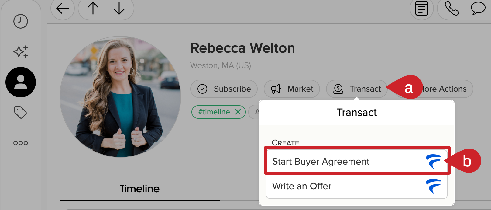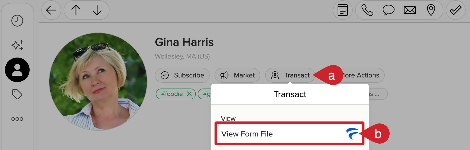 SkySlope Forms is built into Cloze through the Transact menu. Whenever you want to open or start forms, begin by tapping Transact on the contact or property you are working on.