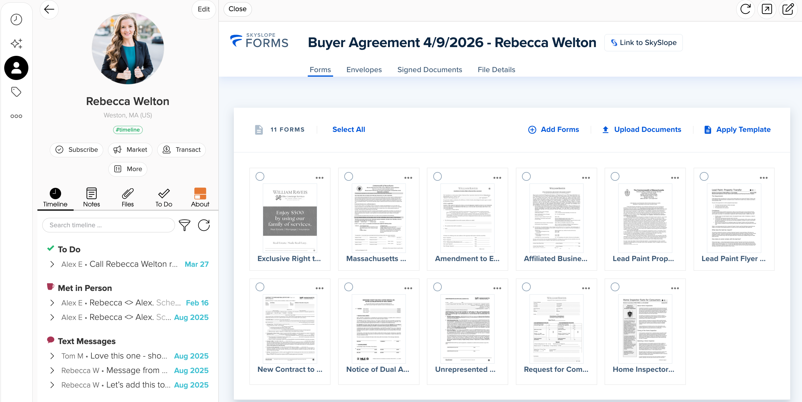 SkySlope Forms is tightly integrated into Cloze, so working with forms feels like part of the same experience rather than a separate step. Instead of sending you to another system’s home screen, Cloze helps take you directly to the right form and brings key information with you, so you can get started faster.